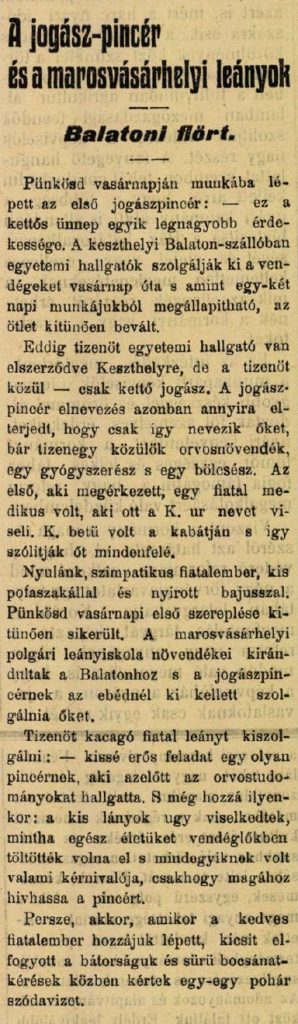 Utazások Jánosy Samuval Jánosy Sámuel 1904 és 1917 között volt a Szentgyörgy utcai református leányiskola nagyrabecsült igazgatója. A nászút A Marosvásárhelyen megjelenő Székely Tanügy 1906. január 15-ei számának 6. oldalán ez a rövid hír jelent meg: „Jánosi Samu, a marosvásárhelyi ev. ref. elemi és polgári iskola igazgatója a napokban váltott jegyet Kakasi Jolán kisasszonnyal, a nagyteremei ev. ref. lelkész kedves, szép leányával. Kísérje boldogság és megelégedés frigykötésüket.” Egy félév múlva a házasságra és a nászútra is sor került. Ez utóbbinak egy kedves emlékét az egyik unoka, Sárkány-Kiss Judit őrzi. Egy Siófokon vásárolt legyezőről van szó, amelynek küllőire fel vannak írva azok a helyek, amelyeken a 36 éves férj és a nála 17 évvel fiatalabb felesége legalább néhány óráig elidőzött vagy megszállt. A legyező tanúsága szerint az ifjú pár kirándulása július első felében zajlott le, és bő két hetet tartott, aztán az utazás fáradalmait Jánosy Sámuel szüleinek tövisi házában pihenték ki. A 120 éves legyezőn a következő települések nevei vannak: Kolozsvár, Budapest, Kaposvár, Fonyód, Bélatelep, Keszthely, Balatonfüred, Tihany, Balatonföldvár, Siófok, Almádi, Kenese, Lepsény, Budapest, Déva, Gyulafehérvár, Tövis. Találkozás az első jogászpincérrel Öt évvel később Jánosy Samu 45 diákjával és 6 kollégájával tért vissza a Balaton vidékére. Körbevonatozták a tavat, több helyen fürödtek, „csolnakáztak”, de műemlékeket is felkerestek (pl. a tihanyi apátságot, Kisfaludy Károly badacsonytomaji házát). És egy szenzációs találkozásban is részük volt. A Székely Naplóban megjelent cikkel ellentétben a jogász-pincérrel a Hullám Szállóban találkoztak, és nem a mellette lévő Balatonban. De mi is ez a cikkben szereplő jogász-pincér? (Előfordul még így is: jogászpinczér, jogász pincér.) 1911-ben a keszthelyi szálloda éttermének működtetője hirdetést tett közzé arról, hogy nyárára tisztességes fizetésért és teljes ellátásért egyetemi hallgatókat alkalmazna pincérnek. Itt meg kell jegyeznünk, hogy akkoriban az egész országban csupán két egyetem létezett: egy Budapesten és egy Kolozsváron. A felvett diákokat a sajtó jogászpincéreknek nevezte, függetlenül attól, hogy milyen szakra jártak. A jogászhallatók kisebbségben voltak közöttük, valószínű azért, mert a jogi kar dékánja helytelenítette a dolgot. Lehet, ez is hozzájárult ahhoz, hogy a jogászpincérekkel hónapokig foglalkozott a sajtó és a közvélemény. A legkülönfélébb cikkek jelentek meg róluk, többnyire pozitív hangvételűek, de sok anekdotaszerű, léha történet is. Az egyik például arról szólt, hogy mint párbajsegédek is remekül beválnak. De született vidám színpadi jelenet is a témában. Nem csoda hát, hogy a marosvásárhelyi református leányiskolán kívül más iskolák értesítőjébe is bekerült ebben az évben, hogy diákjaik balatoni kirándulásuk alkalmával jogászpincérrel találkoztak. Utazások mindenfelé Egyébként ekkor, Jánosy Samu már gyakorlott kirándulásszervező volt, igazgatóságának második évétől rendszeresen szervezett tanulmányi utakat. Először csak Kolozsvárra mentek egy napra, aztán a következő évben már három napos barangolásra indultak a Tordai-hasadékhoz, az Aranyos völgyébe és Torockóra. 1908-ban már hatnapos tanulmányút volt Budapestre és Visegrádra. Később eljutottak vonattal az Al-Dunáig, a Tátráig, Fiuméig és a Román Királysághoz tartozó Szinaján is jártak. A diákok egy jelentős részét mindig ingyen vagy kedvezményes áron vitték el. De a többi diák is olcsón utazott, ugyanis a kiruccanásokat támogatták magánszemélyek és pénzintézetek is. Szállást sok esetben más iskolák biztosítottak, ami tovább csökkentette a költségeket. Az élményekről Jánosy Sámuel részletes beszámolókat írt az évente megjelenő iskolai értesítőkben, de a helyi sajtóban és a Református Szemlében is jelentek meg tudósításai. Az 1913-as, nyolc napos kirándulás tervezetének részlete A 20. század elején más marosvásárhelyi tanintézetek is szerveztek iskolai kirándulásokat, de nem ennyit és ilyen távolságokra. A református kollégiumba járó fiúknak például csupán három nagyobb kirándulásuk volt ugyanebben az időszakban. De felhozhatnánk ellenpéldaként a kolozsvári állami polgári leányiskolát is, amely csak a város környékére szervezett kirándulásokat, rendszerint egy- vagy félnaposakat. Hogy honnan eredt Jánosy Samu lelkesedése az iskolai kirándulások szervezése iránt? Böngészve a nagyenyedi és marosvásárhelyi református kollégium értesítőit, biztosan állíthatjuk, hogy amíg diákként ezekbe az iskolákba járt, nem volt hosszabb kiránduláson. Az egy hónapos kirándulás A legvalószínűbb, hogy Jánosy Samu a századfordulón kedvelte meg az utazást. 1902-1903-ban harmadéves volt a budai Paedagogium nevű tanárképző főiskolán, és az itteni hagyományoknak megfelelően a végzős társaival együtt, kisérőtanár jelenlétében egy őszi, egy hónapos tanulmányútra mentek. Németországban, valamint a Monarchia cseh és osztrák vidékein kirándultak, többnyire vonattal. Élményeiket terjedelmes útirajzokban kellett megörökíteniük, ezekből felolvasásokat tartottak, amelyeket kivetített képekkel tettek még érdekesebbé. Jánosy Samu kézírása Túrázó tanárok a Tátrában Az Országos Polgári Iskolai Egyesület évente, mindig máshol megrendezett közgyűléseit rendszerint kirándulásokkal kötötték össze. Ezzel nemcsak vonzóbbá tették a közgyűlést, hanem példát mutattak, hogy miként kell kirándulásokat szervezni, lebonyolítani. 1905-ben a felvidéki Iglón tartortták me